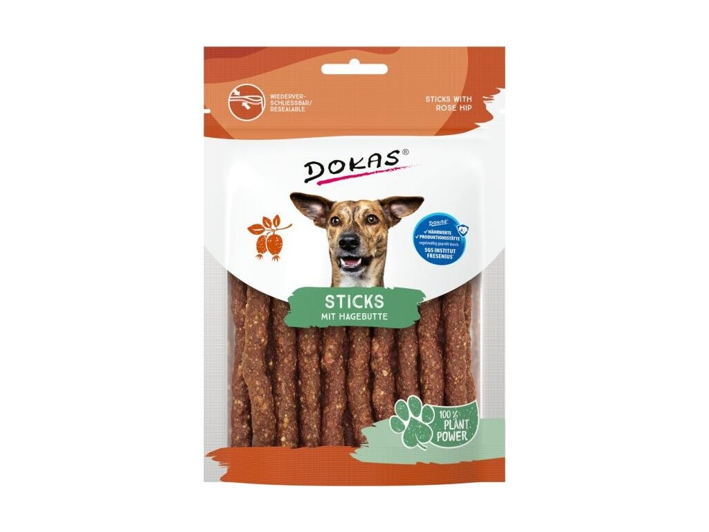 Poloměkké tyčinky vyrobené z rostlinných bílkovinných extraktů, ovoce a zeleniny jsou 100% přírodní bezmasé pamlsky, které můžete podávat vcelku jako měkký žvýkací pamlsek nebo je snadno nalámat na menší kousky a využít je jako odměnu, například při tréninku. Šípky jsou bohatým zdrojem antioxidantů, které chrání buňky před poškozením a díky vysokému obsahu vitamínu C podporují tvorbu kolagenu a tím i zdraví kloubů, srsti a kůže psa. Obsahují pivovarské kvasnice, které jsou bohatým zdrojem vitamínů skupiny B a podporují zdravou srst, kůži, imunitu a celkovou vitalitu psa. Vysoká kvalita použitých surovin zaručuje skvělou chuť a přirozenou vůni, které si váš mazlíček zamiluje, a to bez umělých konzervantů, dochucovadel a barviv. Složení: rostlinné bílkovinné extrakty, banán, rostlinný surový glycerin (řepkový), řepkový olej, šípek 2,2 %, pivovarské kvasnice, červená řepa, cizrna, minerální látky Analýza: hrubý protein 44,2 %, hrubá vláknina 0,5 %, hrubé oleje a tuky 7,0 %, hrubé popeloviny 2,6 %, vlhkost 14,7 % Tyto pamlsky jsou ideální volbou i pro psy s alergiemi na živočišné bílkoviny a pro všechny, kteří preferují ekologicky šetrný životní styl. Baleno ve znovu uzavíratelném obalu, který zajišťuje, že pamlsky zůstanou dlouho čerstvé a voňavé. Psí a kočičí pamlsky Dokas podléhají pravidelným kontrolám kvality světově uznávaným německým institutem SGS Institut Fresenius – nezávislá laboratoř patřící mezi přední evropské společnosti testující kvalitu potravin. Podávejte jako odměnu. Zajistěte dostatek pitné vody. Po otevření pečlivě uzavřete zipem a skladujte v suchu a chladu. Balení obsahuje kyslíkový absorbér pro uchování kvality výrobku.