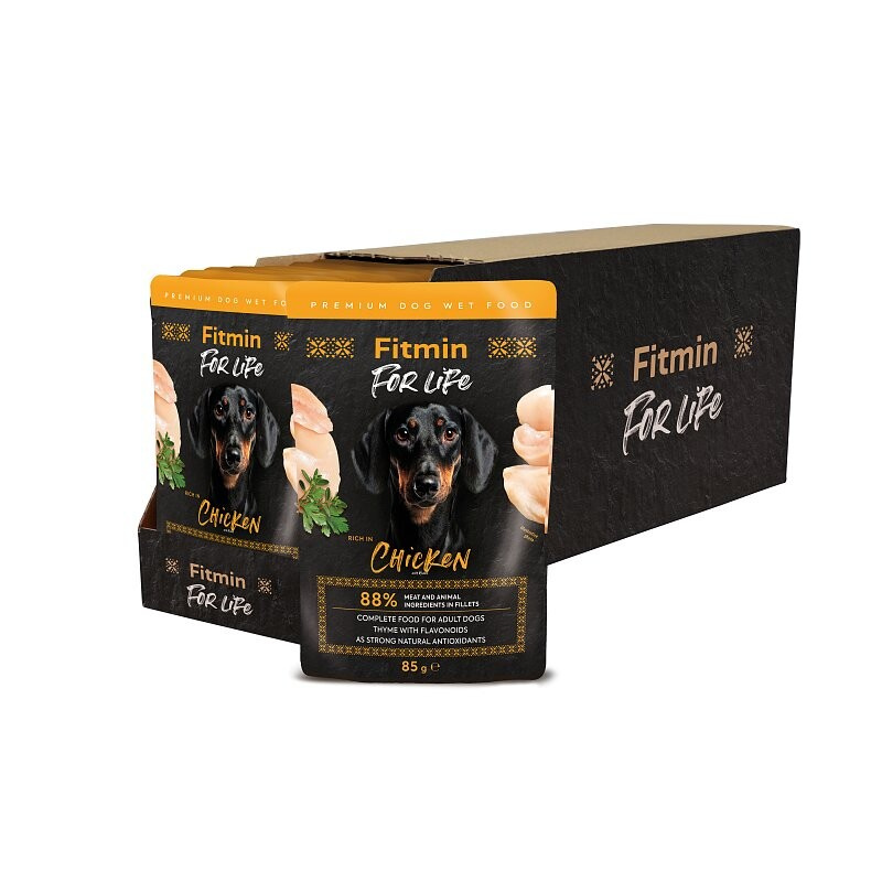 Masová kapsička s kuřecím masem a bylinkami uspokojí i vašeho psa. Šťavnatá kapsička pro psy s kuřecím masem obsahuje až 88 % masa ve filetkách s omáčkou a bylinkami. Nabízíme vám skvělou chuť dušených filetek s bylinkovým želé v kapsičkách pro psy i štěňata. Kapsičky pro psy navíc obsahují inulin pro podporu trávení, vitamín D3 pro zdravé zuby a kosti i lněný olej pro lesklou srst a zdravou kůži.