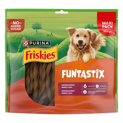 Lahodná kroucená pochoutka s příchutí slaniny a sýra vyrobená z těch nejlepších ingrediencí, bez přidaných umělých barviv. Friskies Funtastix může být podávána kdykoli jako pochoutka nebo odměna, a to buď vcelku, nebo rozlomena na kousky.