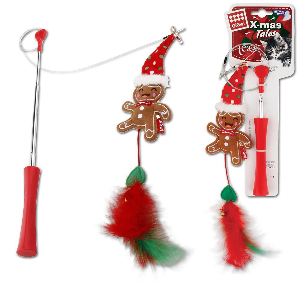 Teleskopická, nerezová udice s textilní hračkou - vánočním perníčem, ozdobneným peřím a kovovou rolničkou. Ideální hračka k vánočnímu stromečku.