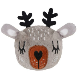 Plyšem potažený tenisový míček v podobě hlavy spícího soba s parohy, oušky a vyšívaným obličejem je ideální aportovací hračkou pro sváteční období.