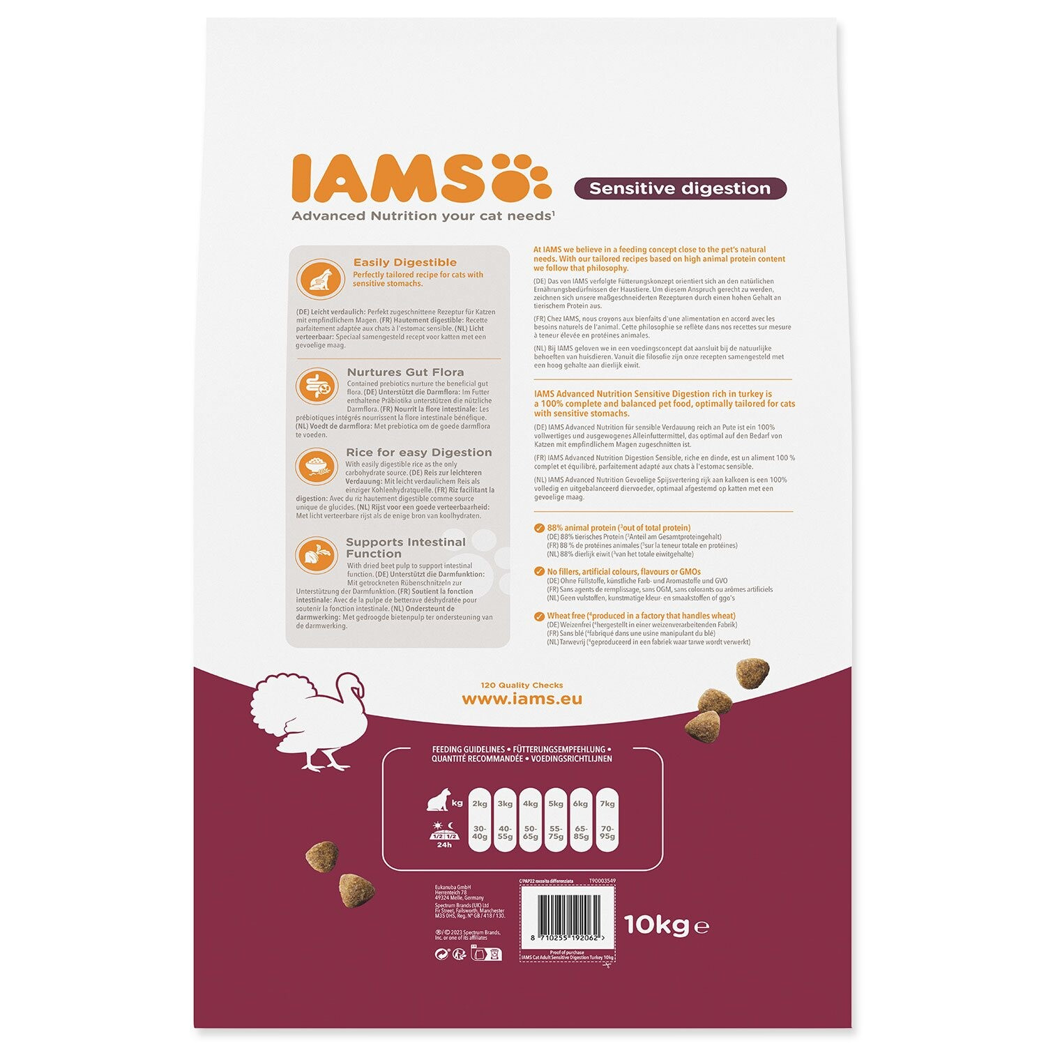 Krmivo IAMS for Vitality Sensitive Digestion pro dospělé a starší kočky s vysokým obsahem krůtího masa je 100% kompletní a vyvážené, odborníky sestavené krmivo, které podporuje sedm znaků zdraví a vitality kočky a pomáhá s citlivým trávením. Veškeré živiny jsou obsažené v lahodné receptuře s 88% obsahem živočišných bílkovin, na které si vaše kočky pochutnají každý den.