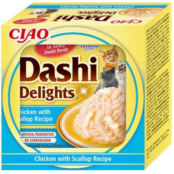 Kuřecí maso, hřebenatka a jemné tuňákové vločky v lahodném vývaru. Daši je tradiční japonský rybí vývar z tuňákových vloček známý svou výjimečně lahodnou chutí. Jeho zařazení do jídelníčku vaší kočky může dodat krmení nový rozměr a učinit z něj skutečný zážitek. Daši navíc poskytuje důležité živiny včetně vitamínů a minerálů a díky nízkému obsahu kalorií a tuku je zdravým doplňkem stravy. Je to produkt na bázi vývaru, obsahuje tedy vysoké množství vody, čímž přispívá k hydrataci organismu a k prevenci potíží močového ústrojí.