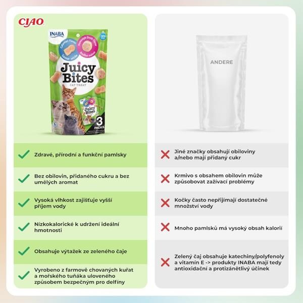 Pamlsky Inaba Juicy Bites ve dvou příchutích – krevety a mořské plody – jsou vláčné, měkké, přirozeně chutné a hlavně zdravé. Vyrobeny jsou z pravého tuňáka a kuřat chovaných na farmách, mají nízký obsah kalorií a neobsahují obiloviny, konzervanty ani umělá barviva. Pro kočky mají ideální velikost a pro radost všech zúčastněných zábavné tvary.