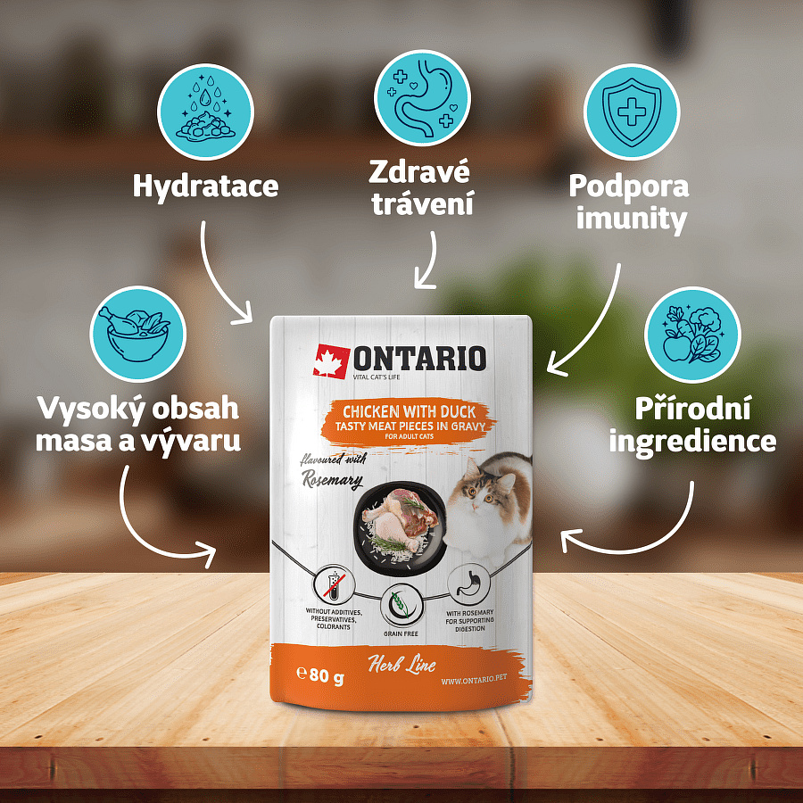 Každý majitel ví, že kočky milují rozmanitost a výrazné chutě. Kapsička Ontario kuře a kachna v omáčce 80 g přináší spojení dvou druhů drůbežího masa, které je bohaté na bílkoviny a vitamín B3. Omáčka nejen skvěle chutná, ale pomáhá vaší kočce dodržovat pitný režim, což je základem pro zdraví jejích ledvin. Dopřejte své kočce hostinu, která voní po čerstvých surovinách a bylinkách.