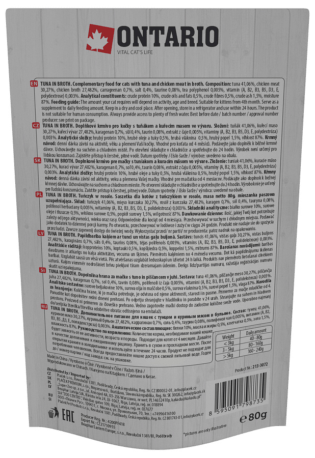 | Složení: | Maso a výrobky živočišného původu, ryby a výrobky z ryb 71,33 % (tuňák 41,06 %, kuřecí maso 30,27 %), kuřecí vývar 27,482 %, karagenan 0,7 %, sůl 0,4 %, taurin 0,08 %, extrakt z čaje 0,005 %, vitaminy (A, B2, B3, B5, D3, E, polydextróza) 0,003 %. |