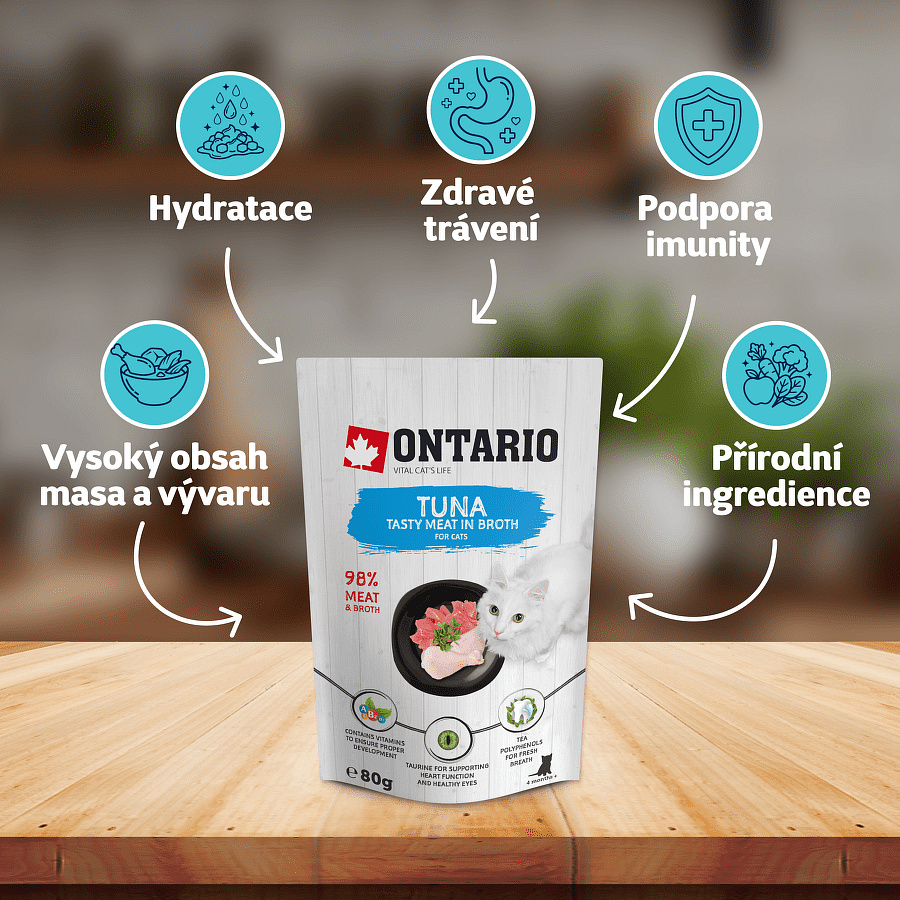 Někdy je v jednoduchosti největší síla. Kapsička Ontario tuňák ve vývaru 80 g sází na osvědčenou kombinaci tuňáka a kuřecího masa. S více než 71 % masa jde o vysoce výživné doplňkové krmivo, které uspokojí i ty nejnáročnější šelmy. Vývar napomáhá správné funkci ledvin, zatímco taurin se stará o to, aby srdce vaší kočky tlouklo jako zvon. Bez barviv, bez lepku, jen čistá radost z jídla.