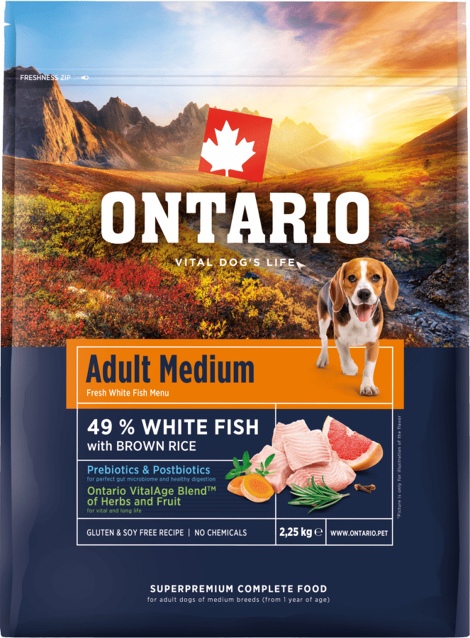 Ontario receptura je navržena tak, aby splnila nutriční požadavky dospělých psů středních plemen, předepsané evropskou federací FEDIAF. Tvar a barva každé granule se může nepatrně lišit. Skladujte na chladném a suchém místě, bez přímého slunečního záření. Vyrobeno v České republice.