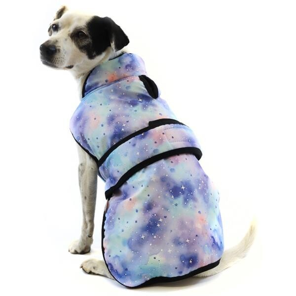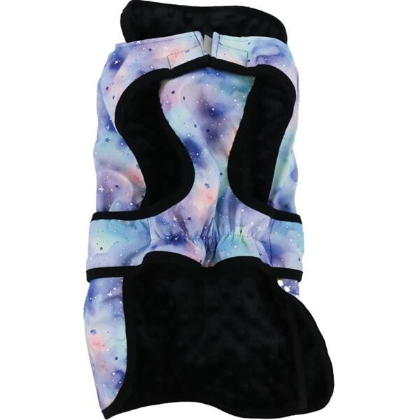 Zimní vesta Nebula XL LUX je určena psům s větším obvodem hrudníku. Svrchní vrstva z nepromokavého materiálu je zateplená vafixem a flanel fleecem (tzv. minky). Obleček je tvarovaný tak, aby psa neomezoval v pohybu, a přitom chránil všechny důležité partie jeho těla před chladem, větrem, deštěm i sněhem. Zateplený stojáček kryje šíji, gumičky na stehna zajišťují, aby obleček neodstával v zadní části, a elastický lem brání úniku tepla po celém obvodu. Za krkem je otvor pro připnutí vodítka k obojku a poutko pro zavěšení (při sušení atd.). Oblékání je snadné a rychlé: vesta se zapíná na suché zipy – 2 pod krkem a 1 na zádech (na hrudním pásu). Samozřejmostí jsou reflexní prvky.