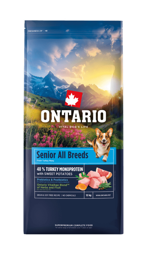 Ontario receptura je navržena tak, aby splnila nutriční požadavky starších psů všech plemen, předepsané evropskou federací FEDIAF. Tvar a barva každé granule se může nepatrně lišit. Skladujte na chladném a suchém místě, bez přímého slunečního záření. Vyrobeno v České republice.