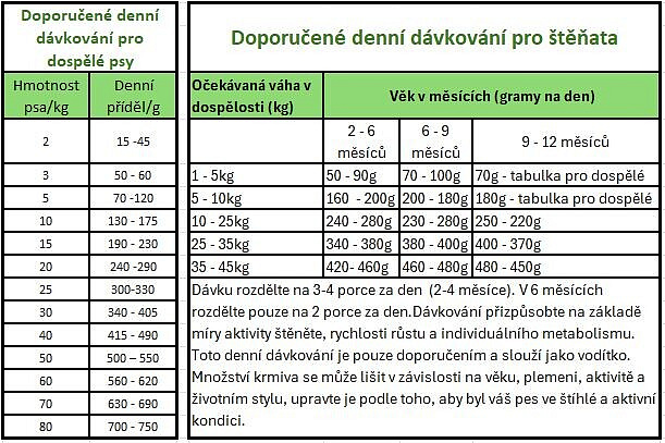 Denní dávkování je pouze doporučením a slouží jako vodítko. Množství krmiva se může lišit v závislosti na věku, plemeni, aktivitě a životním stylu, upravte je podle toho, aby byl váš pes ve štíhlé a aktivní kondici.