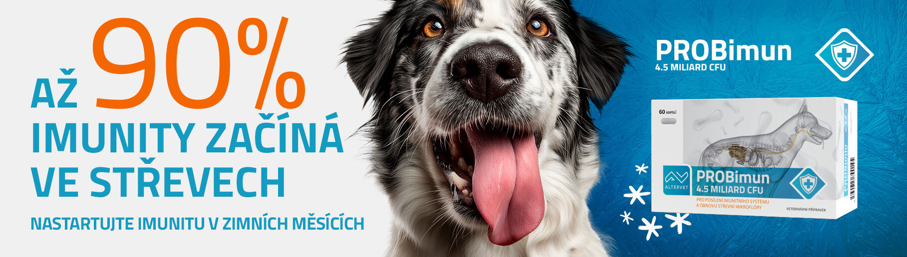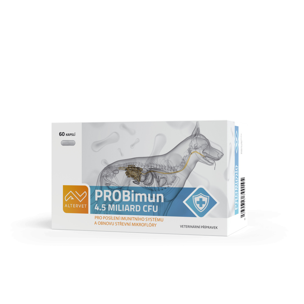 PROBimun je inovativní veterinární přípravek, který obsahuje jedinečnou kombinaci 6 probiotických kultur, betaglukanu a kolostra. Každá kapsle obsahuje až 4,5 miliard CFU živých probiotických bakterií, které jsou klíčové pro obnovu, posílení a regeneraci střevní mikroflóry. Důležitým benefitem PROBimunu je jeho schopnost posilovat imunitní systém a přispívat tak k duševní pohodě zvířete. Pravidelné užívání tohoto přípravku může vést k celkovému zlepšení zdraví a vitality vašeho zvířecího společníka.
