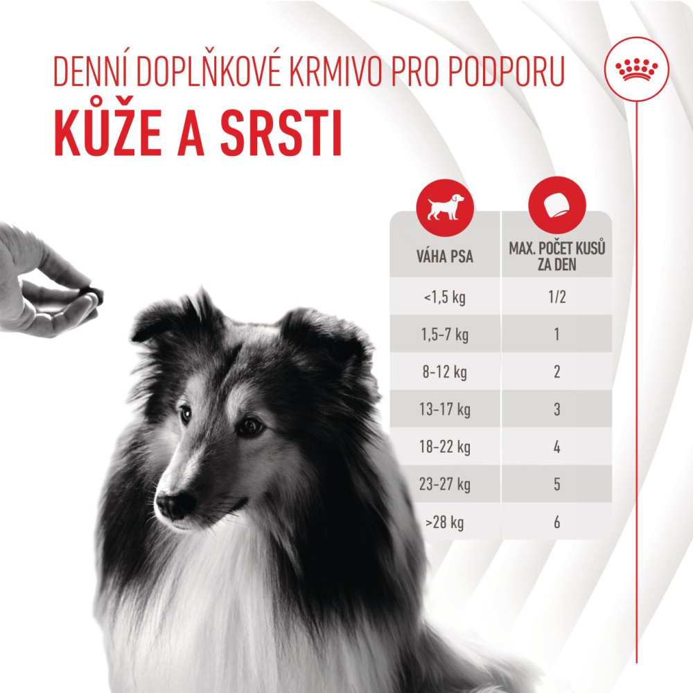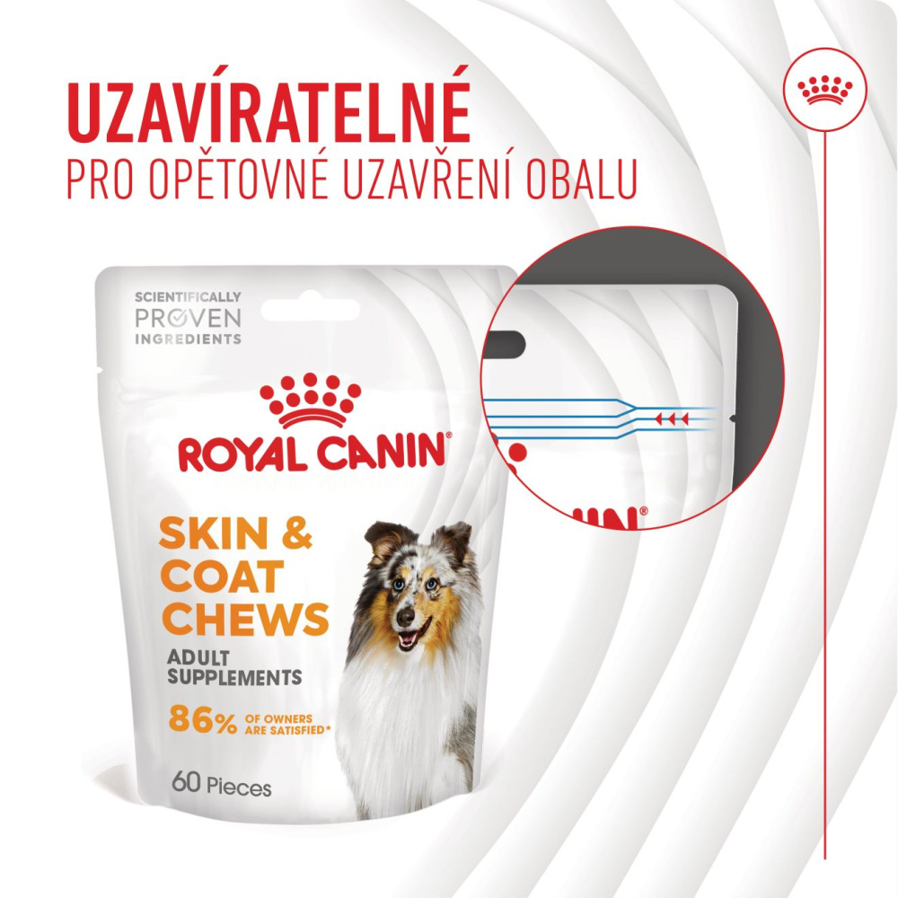 ROYAL CANIN® SKIN & COAT CHEWS ADULT SUPPLEMENTS se bezproblémově začlení a podpoří zdraví kůže a lesklou srst. Díky tomu může váš pes zachovat svůj stávající stravovací režim a zároveň dostávat cílenou podporu, která mu pomáhá prospívat.